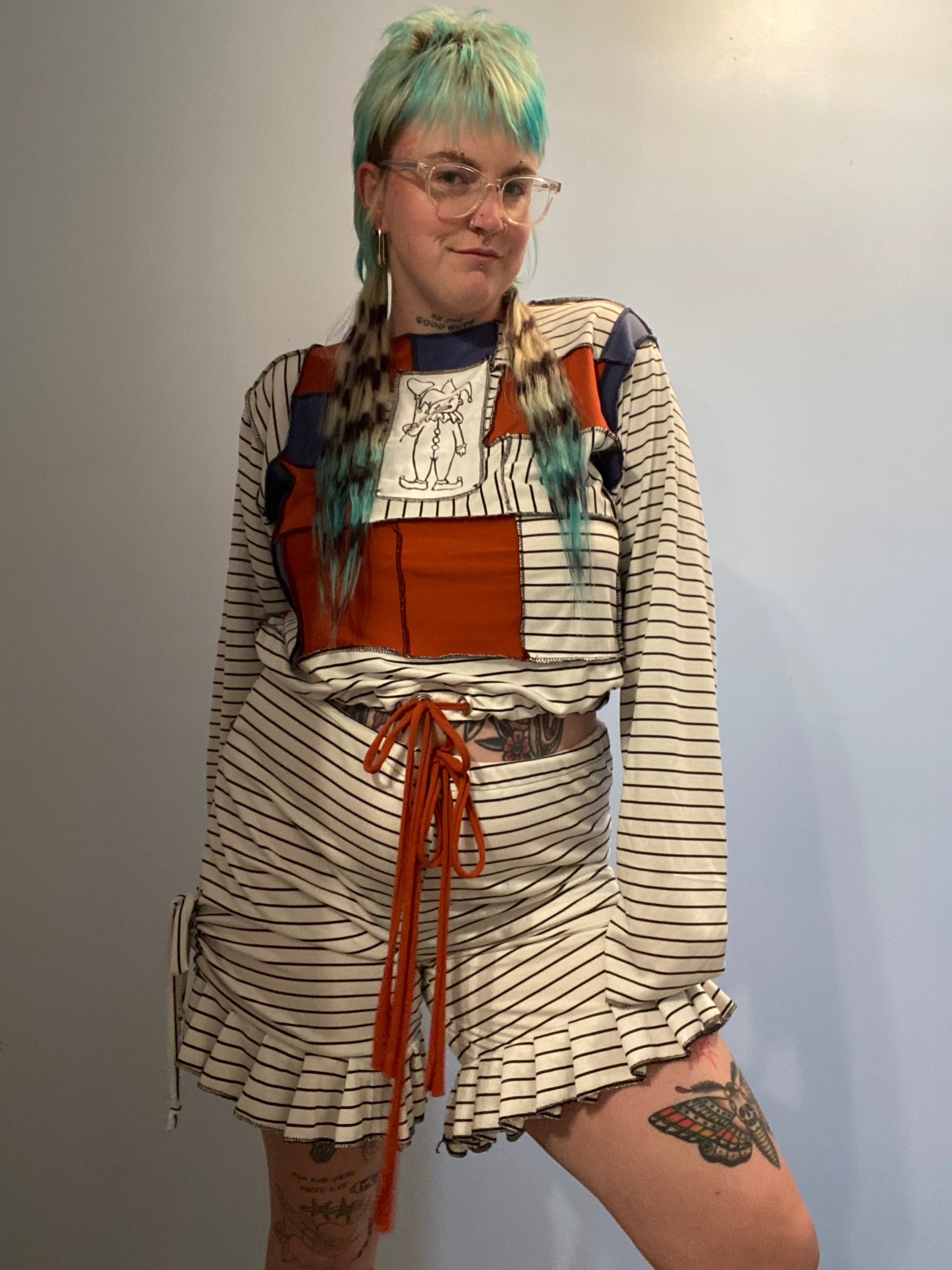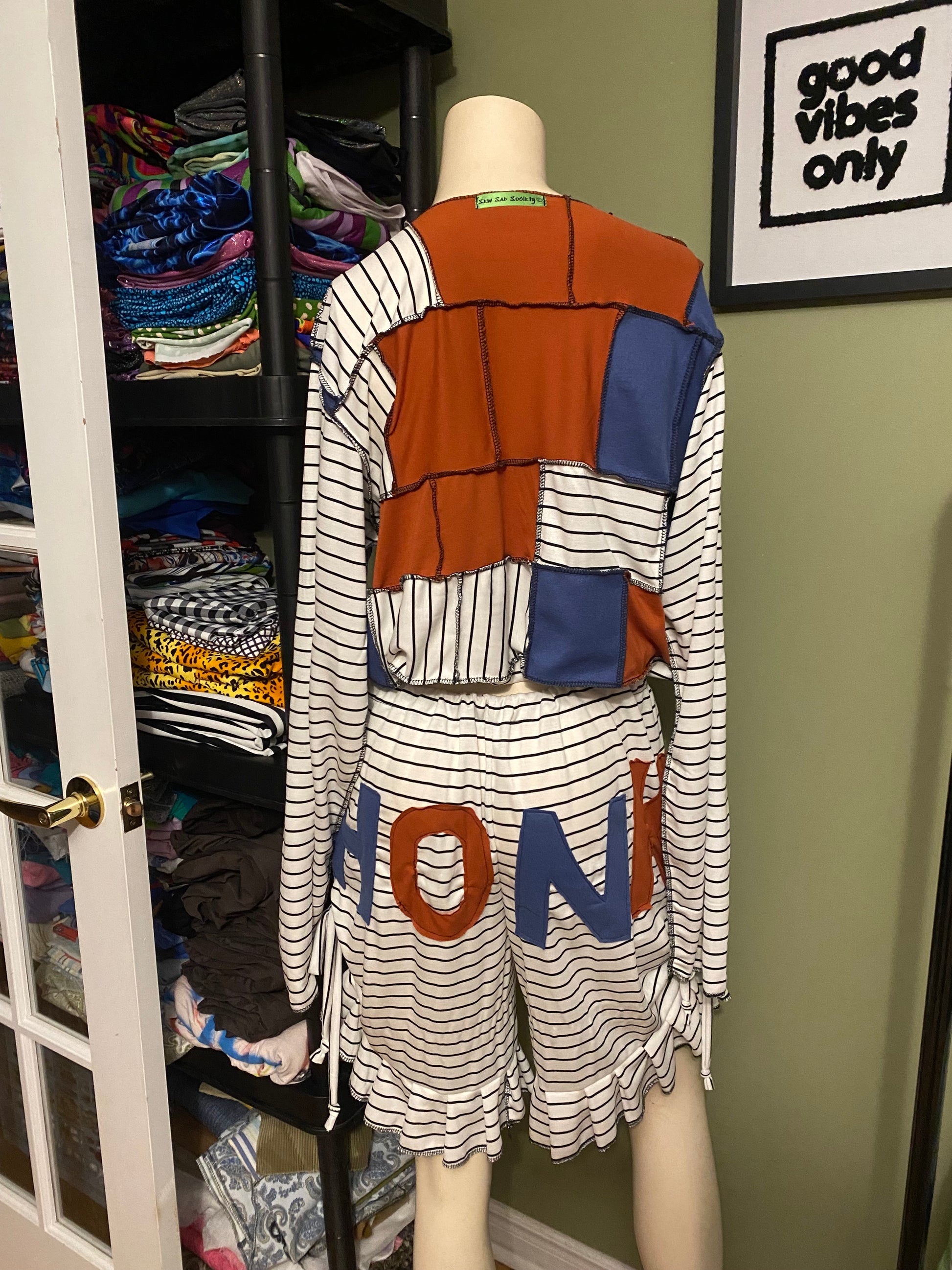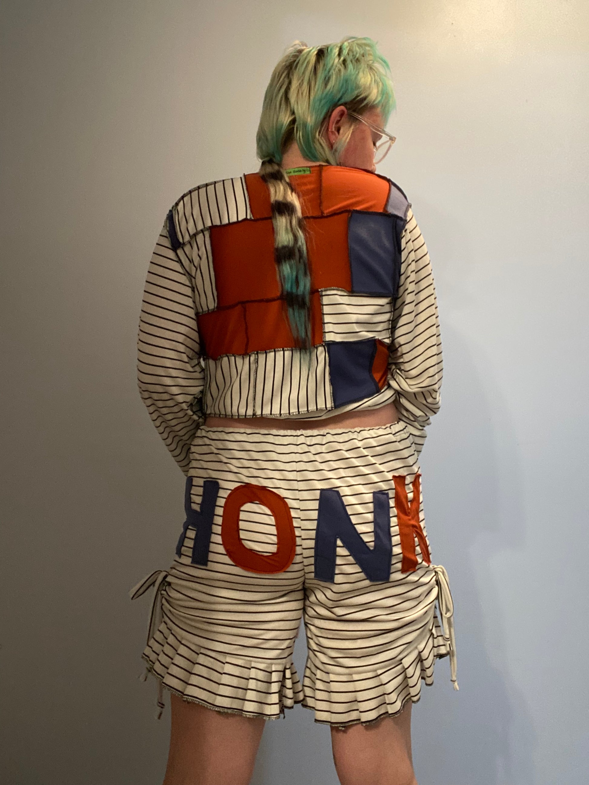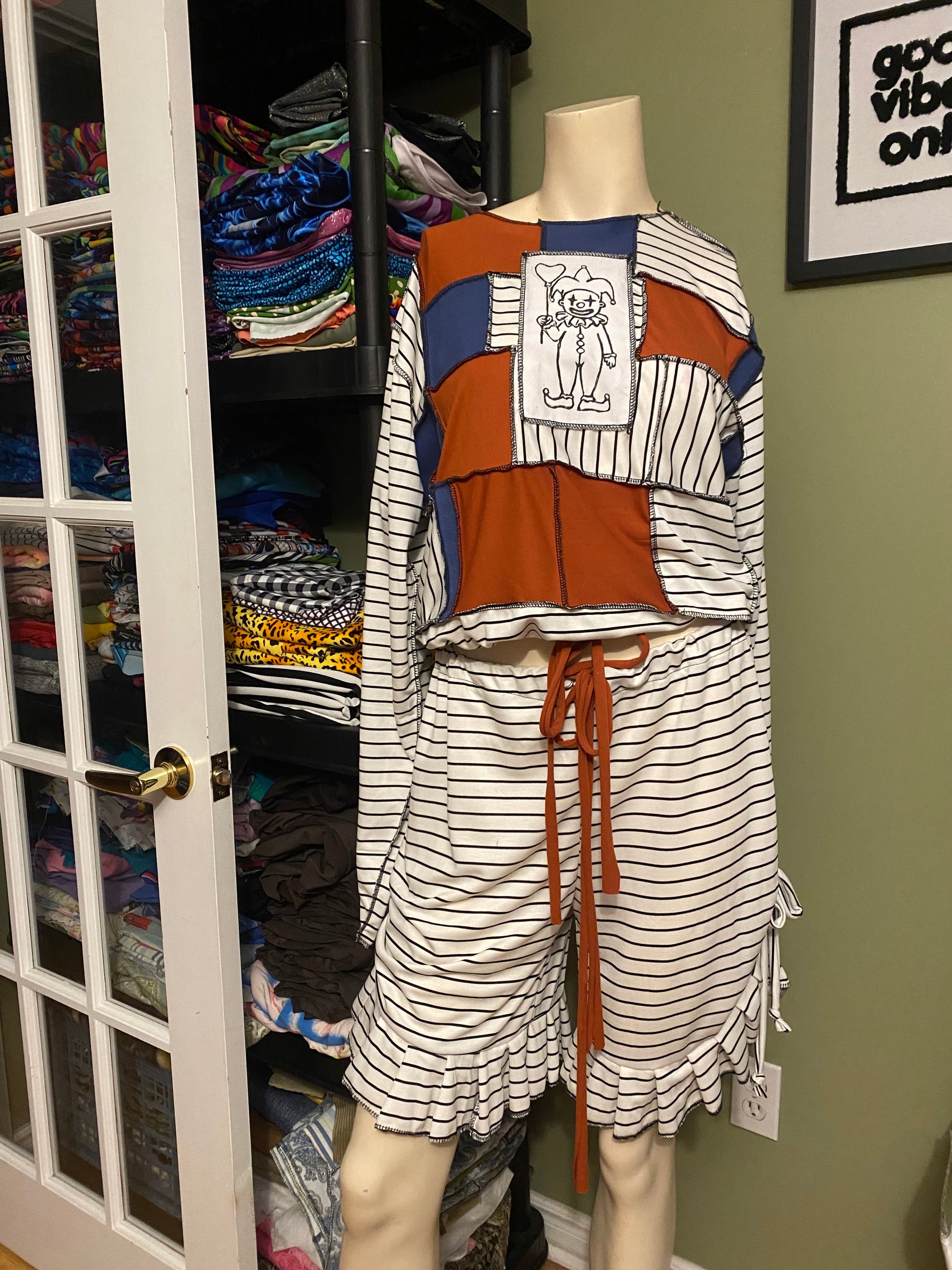 Adjustable, 1/1 patchwork set with lino block print clown detail on shirt and HONK detail on shorts.
