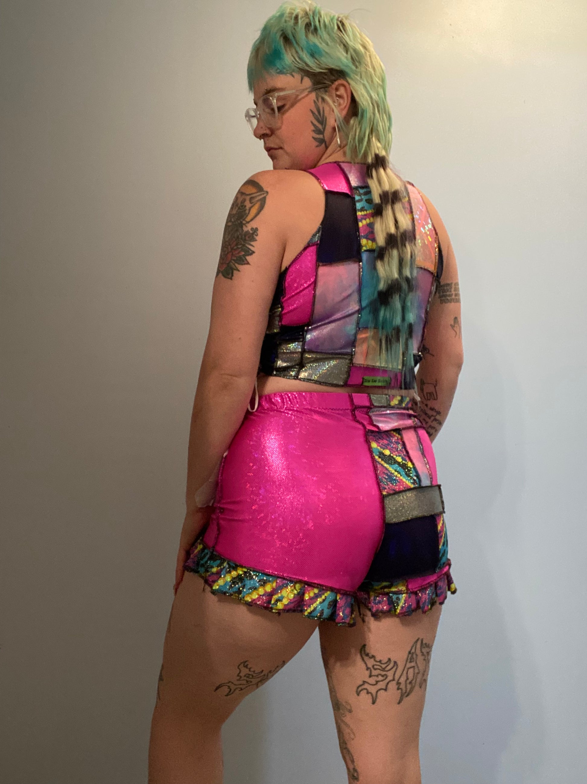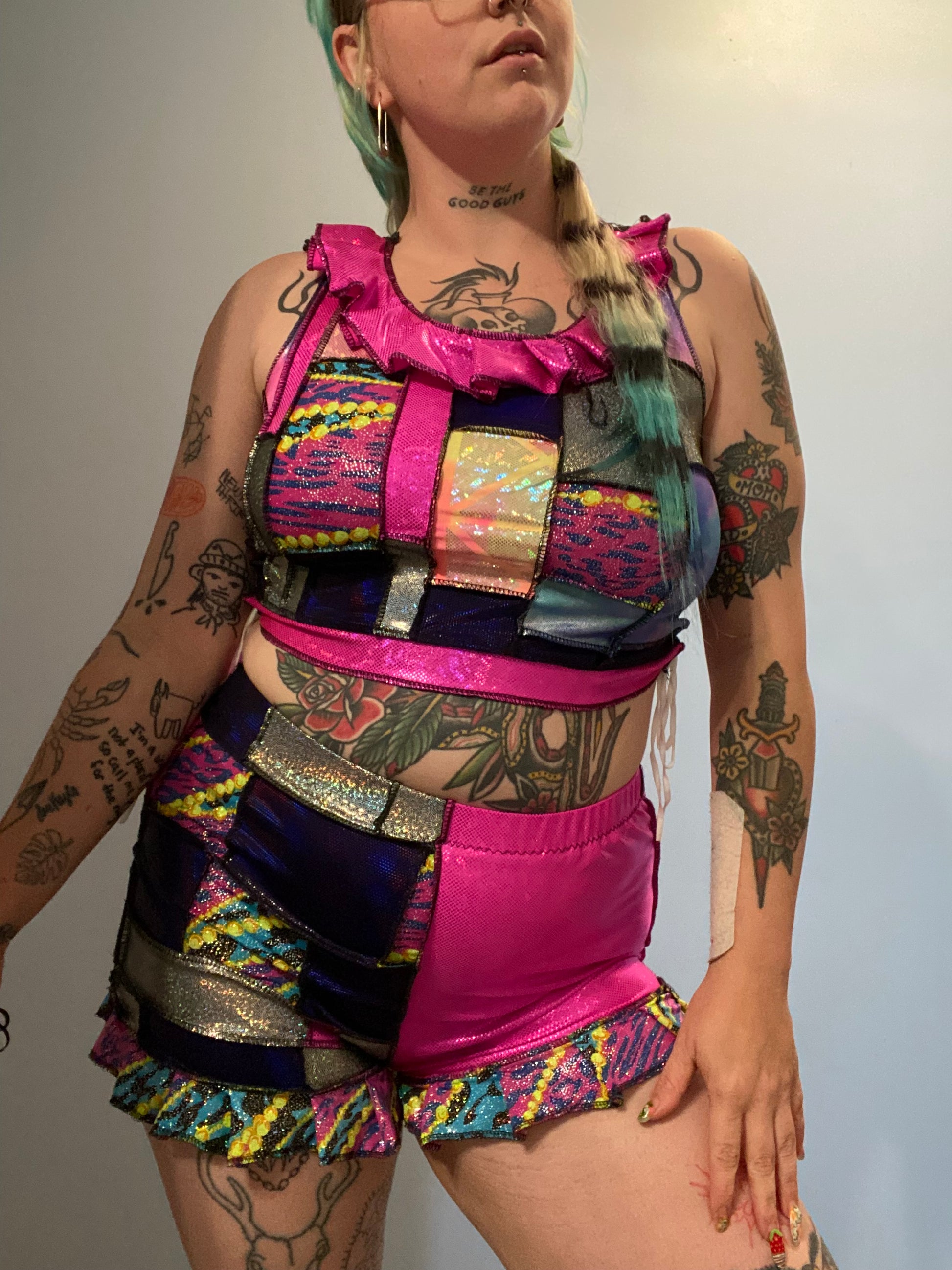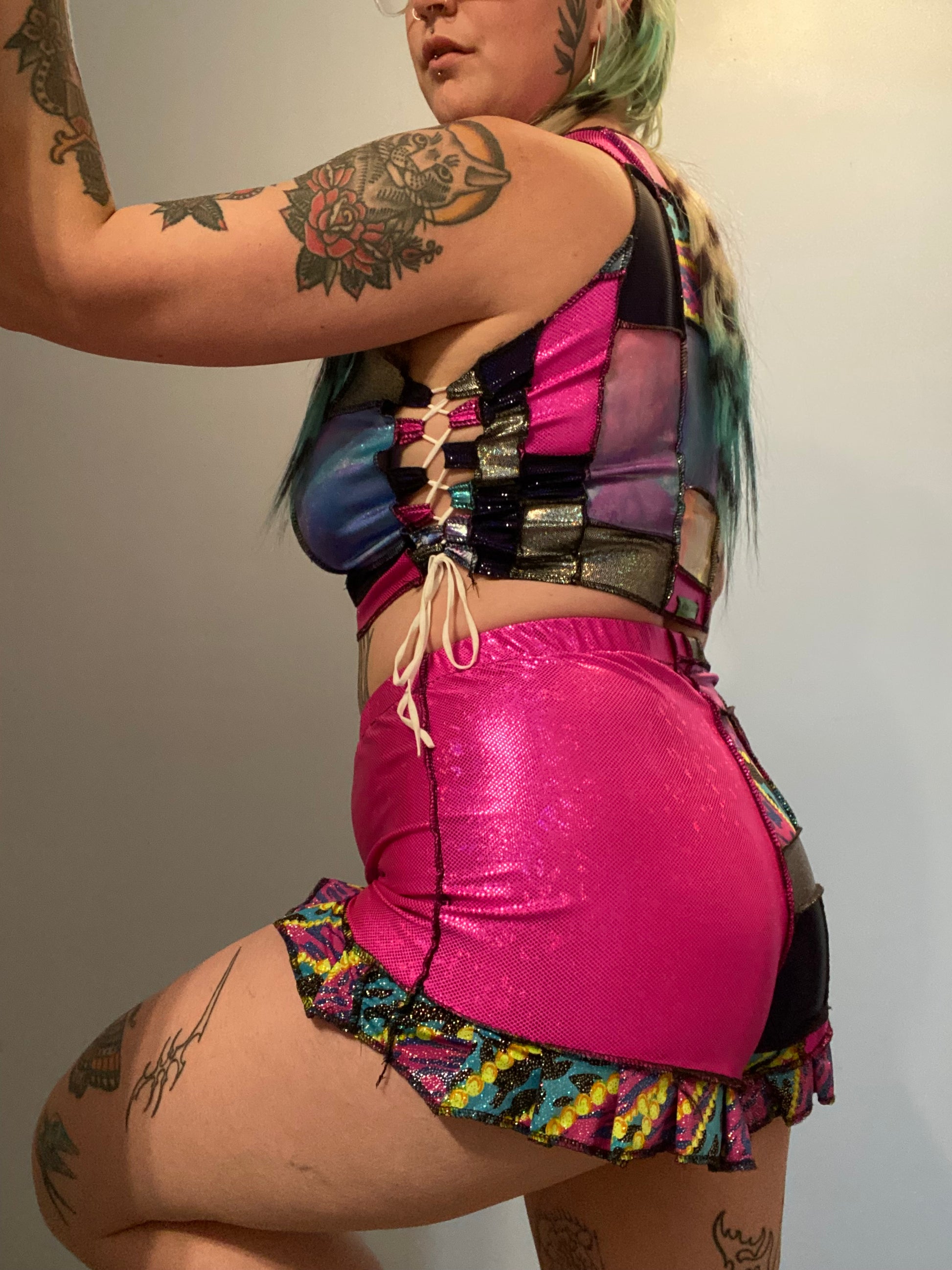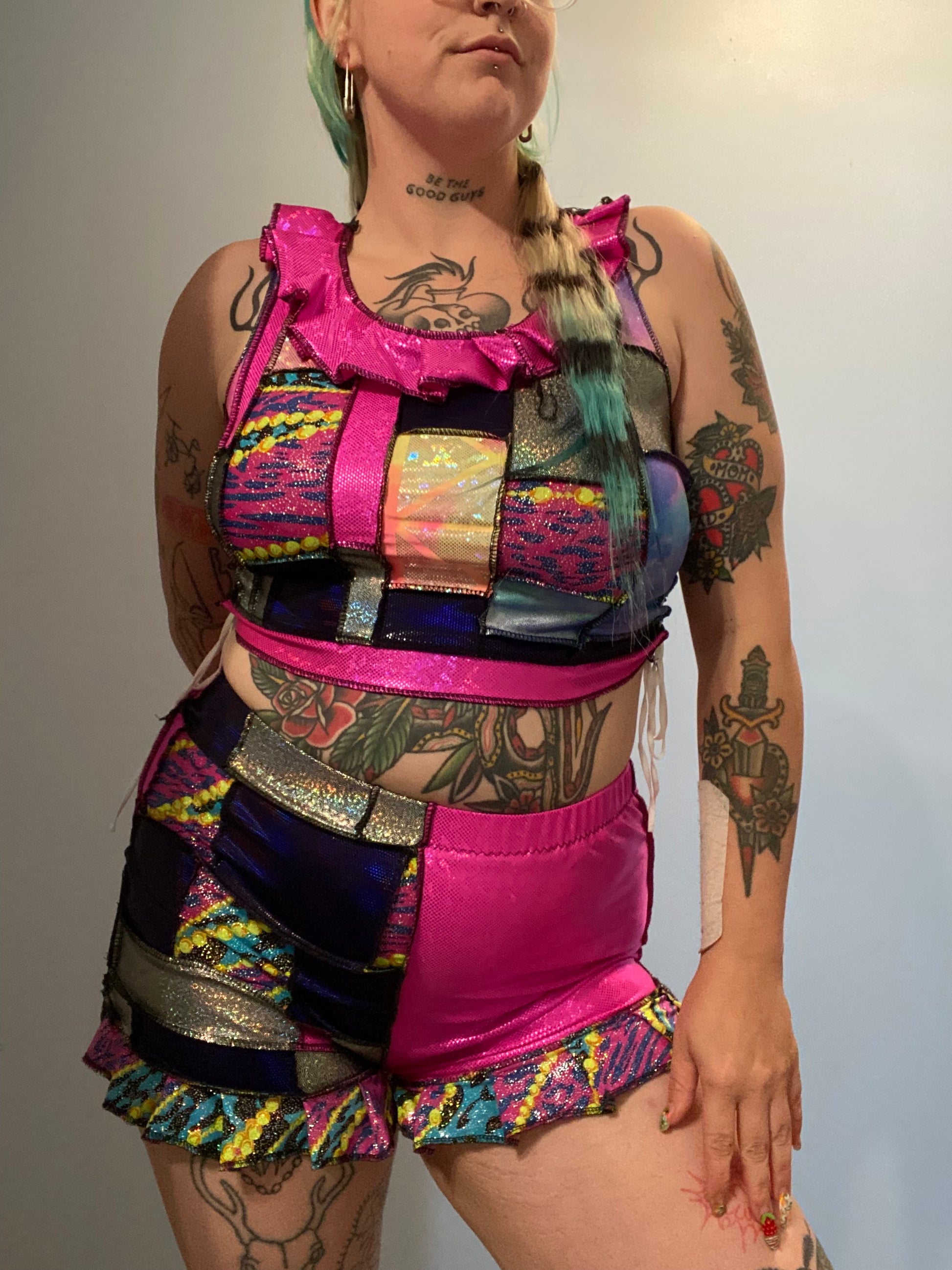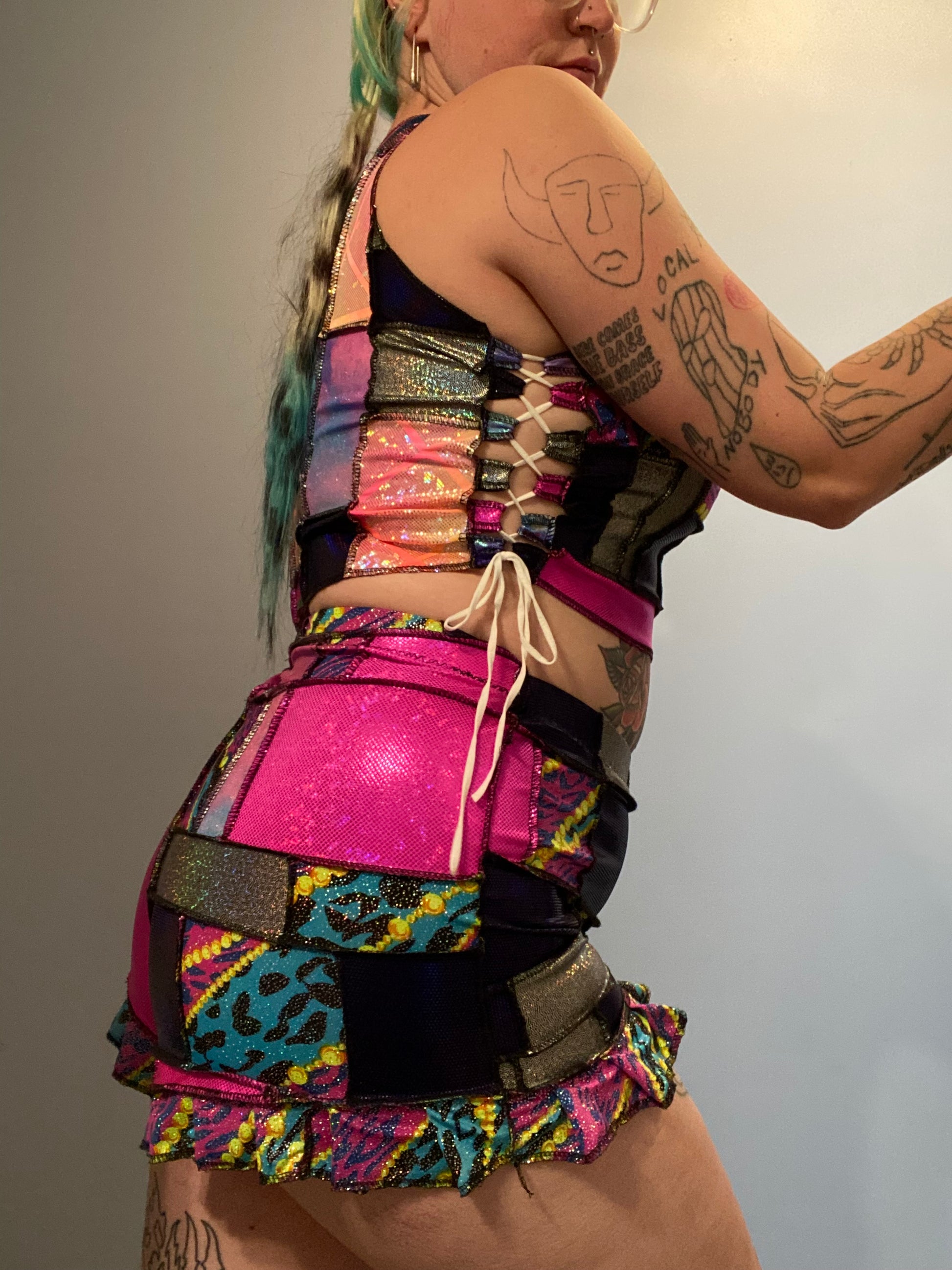 L/XL, 1/1 patchwork clown inspired set with adjustable lace up sides on the top.